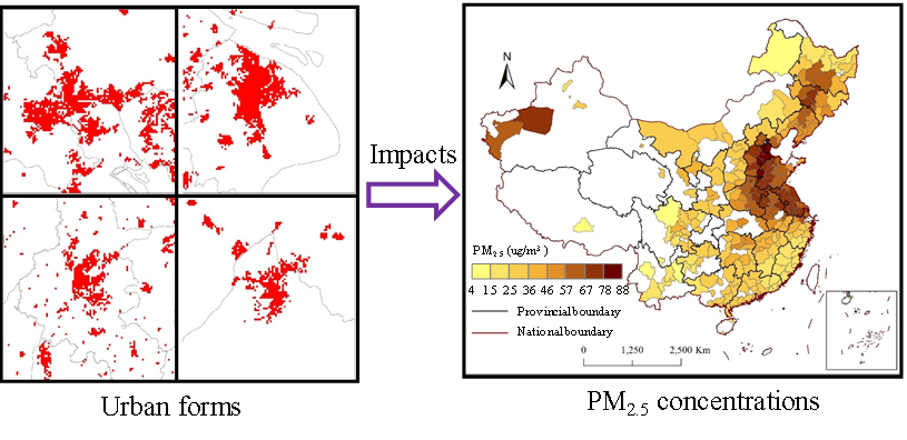 施开放副教授研究小组结合夜间灯光、NDVI等多源遥感数据,在提取我国250个地级市PM2.5浓度(尤其是非点源PM2.5排放)的基础上,构建了大尺度长时序的城市空间形态数据集,结合计量经济学模型探讨城市空间形态与PM2.5浓度的相关性。研究发现城市急剧扩张对我国中等城市和特大城市PM2.5浓度有显著的正向影响。城市空间形态的紧凑性有利于大城市PM2.5浓度的降低,而城市空间形态的不规则性工业城市的PM2.5浓度的上升起着重要作用。此外,与其他地区相比,紧凑而相连的城市空间形态更有利于减少北方地区的PM2.5浓度