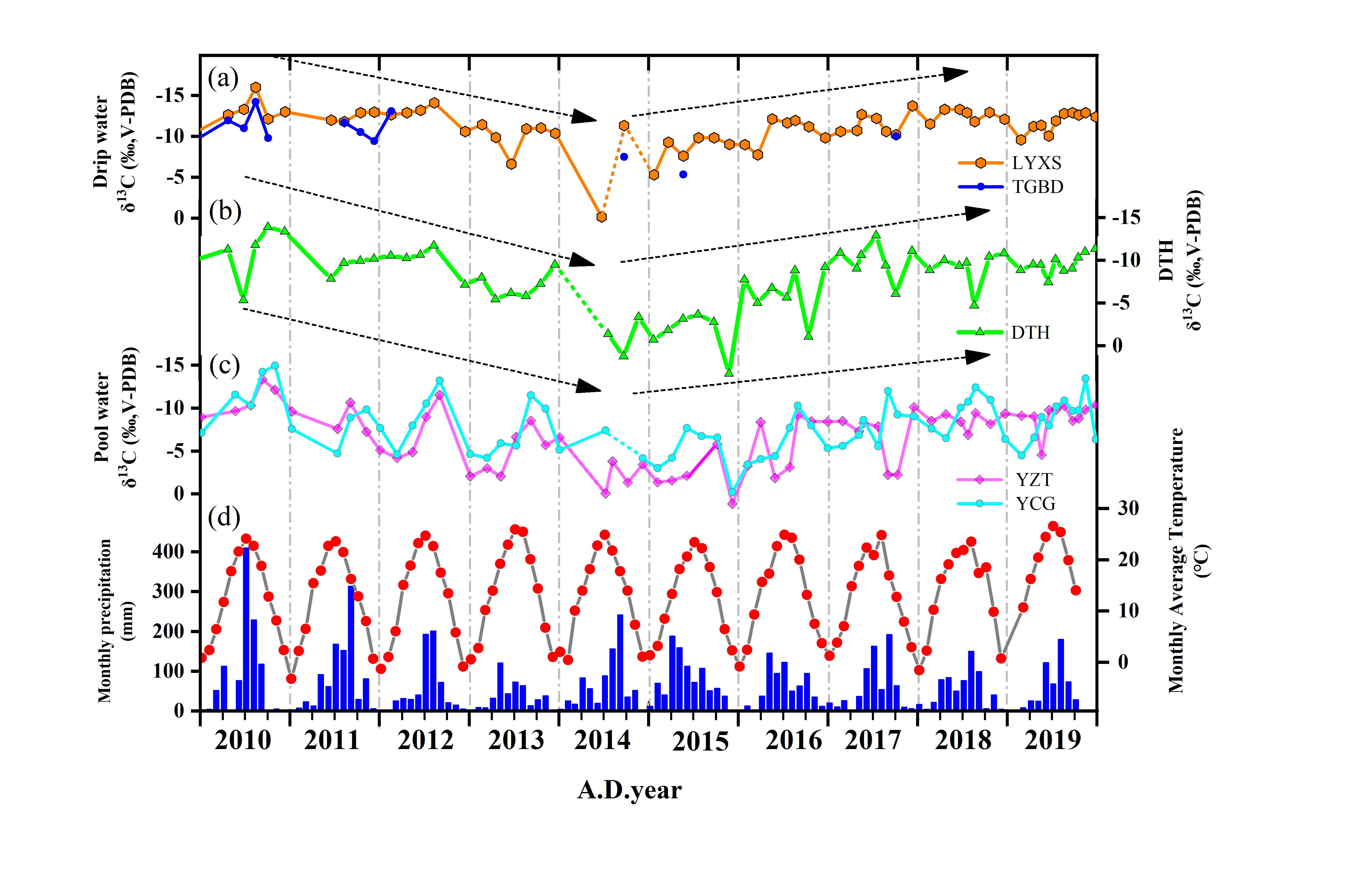 2020年12月11日,国际著名水文学期刊Journal of Hydrology (TOP期刊)在线发表了388vip太阳集团、岩溶环境重庆市重点实验室杨琰教授所带领的研究小组的最新科研成果。洞穴监测可以厘清碳同位素信号在岩溶关键带中的传输过程,对揭示岩溶系统碳同位素的影响因素及其运移机制有重要意义。但是碳同位素影响因素复杂,需要通过多年监测以及近百年高分辨石笋记录来揭示不同尺度气候变化对δ13C记录的影响。