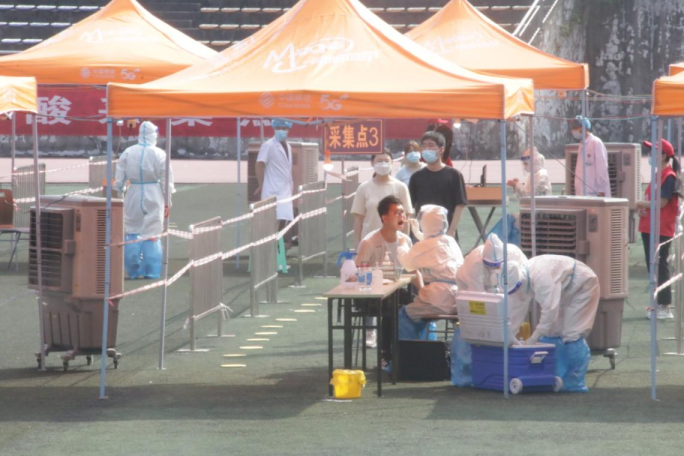 跟随新生的脚步来到第二运动场,医疗人员们坚持奋战,不分昼夜地为新生们进行核酸检测,争取做到在第一时间了解疫情,第一时间控制疫情。志愿者们坚持奋战在自己的工作岗位上,忙得不亦乐乎。