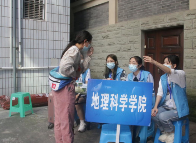 地科院新生入校,首先需要携带录取通知书、身份证原件、健康码“绿码”、行程码“绿码”和核酸检测阴性证明,在进入校园时提供给工作人员核验,然后在公司志愿者的引领下找到自己的宿舍楼下。在地科院的迎新登记服务点进行报道并领取新生纪念地图后,就到宿舍管理员值班室进行信息的登记并领取宿舍钥匙,到达寝室后需第一时间向辅导员报告“已入住”。在新生们将寝室整理好后,重庆市外来校同学需要携带身份证去第二运动场进行一次核酸检测。当检测完毕后,向辅导员报告,并尽快返回寝室。在核酸检测结果出来之前争取做到宿舍和食堂之间“两点一线”,以响应公司对疫情防控的要求。