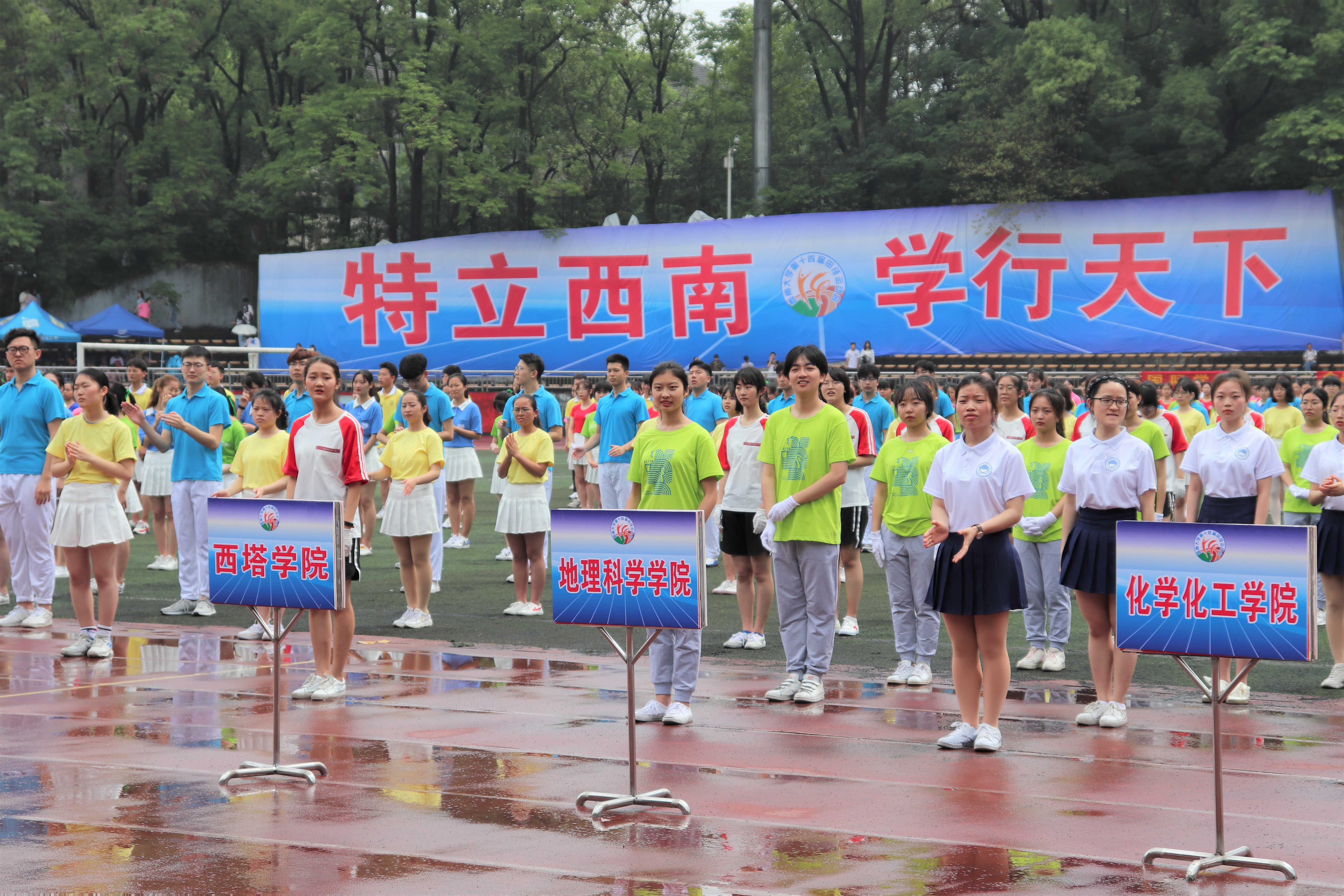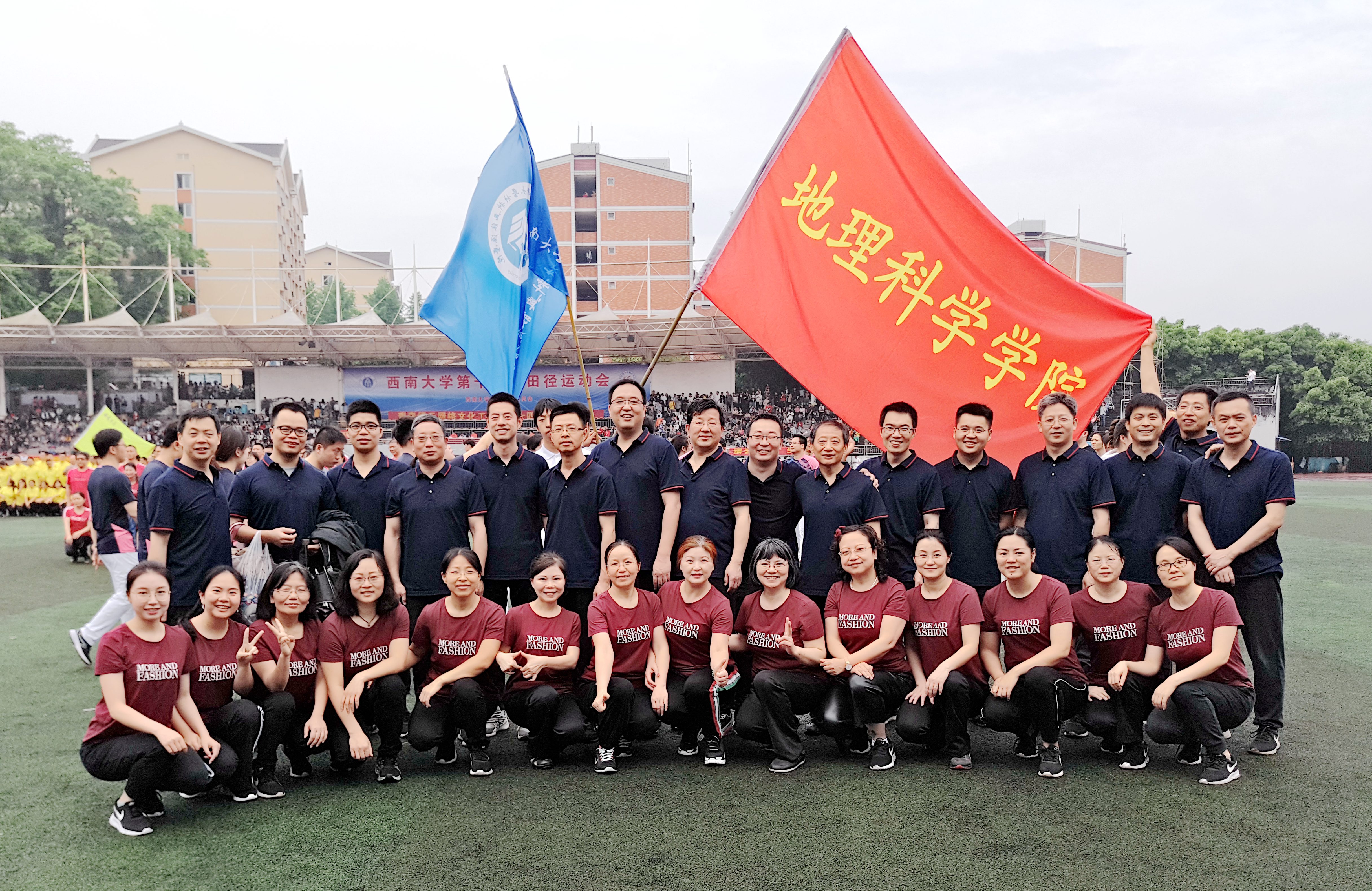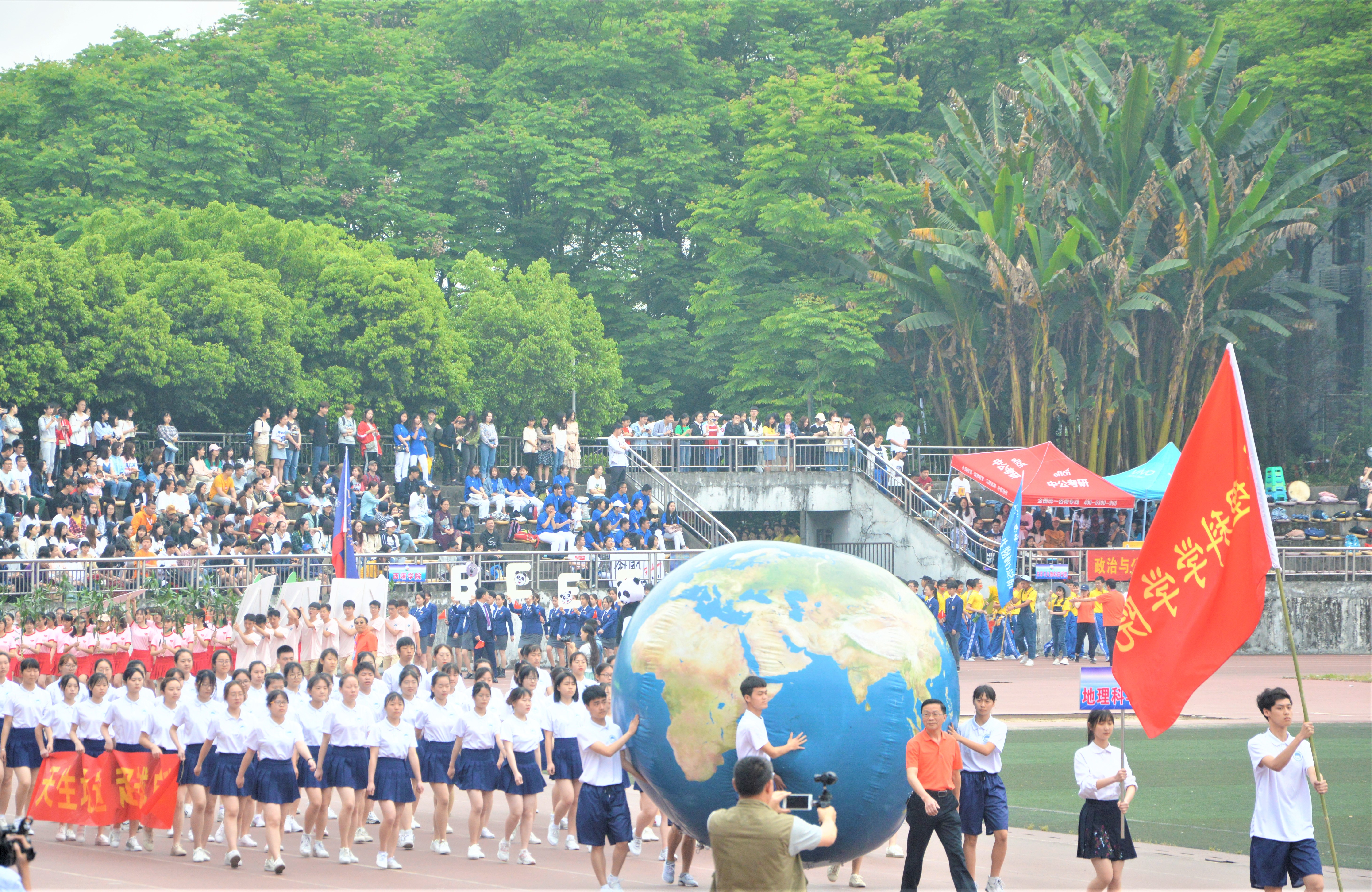 18日上午,开幕式在第二运动场隆重举行。由公司师生60余人组成的地理科学公司方阵在公司党委副书记何凯老师的带领下走过主席台。四位同学高举“地球模型”,方阵师生在主席台前高喊“天生地造,超越自我”的运动口号,引来运动场观众掌声连连。