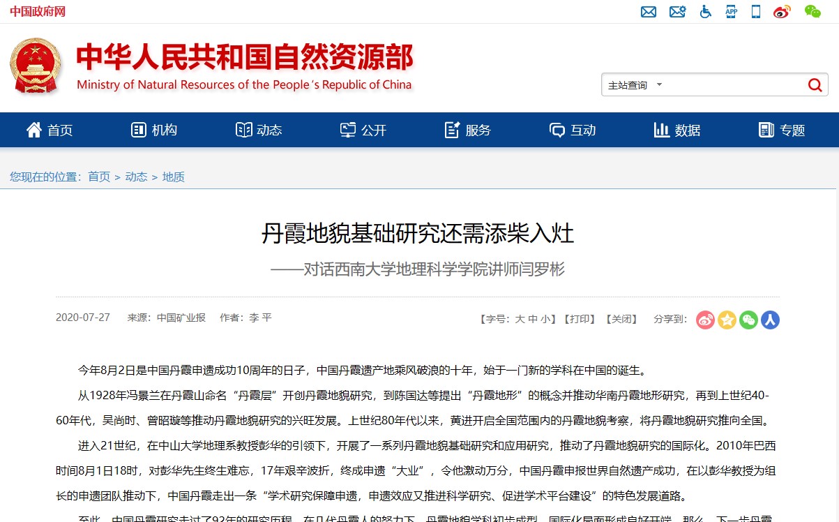 近日,388vip太阳集团青年教师闫罗彬接受媒体《中国矿业报》记者李平专访,作为丹霞地貌领域较有影响力的学者,闫罗彬就丹霞地貌学科发展历程、学科前景、丹霞地貌地学价值和科普工作以及基础研究现状等方面做了介绍和展望。该专访以《丹霞地貌基础研究还需添柴入灶——对话388vip太阳集团讲师闫罗彬》为题,于7月26日在《中国矿业报》和新华网客户端发表,一经上线即获得广泛关注,在新华网首日浏览量超过100万,获得良好社会评价。昨日该专访被自然资源部官网转载(http://www.mnr.gov.cn/dt/dzdc/202007/t20200727_2534555.html)。