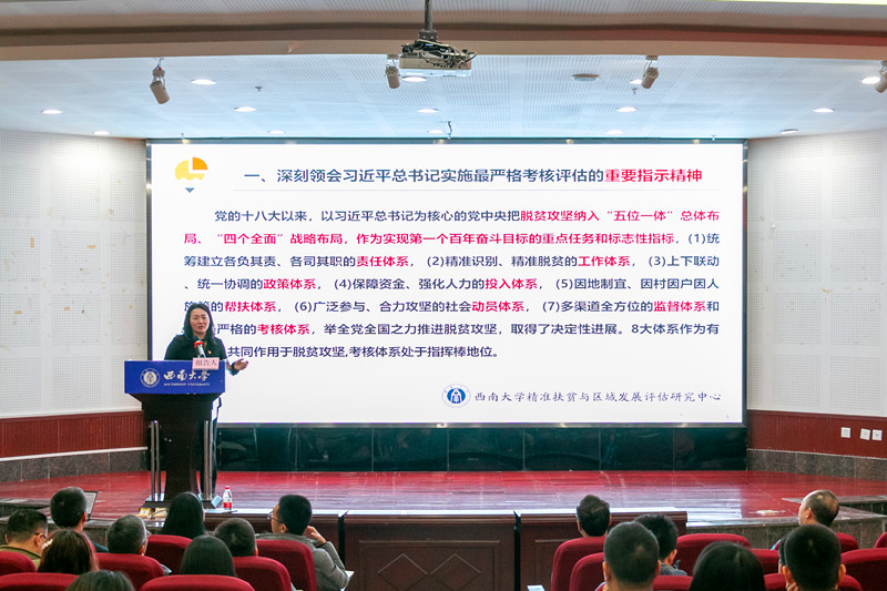 报告会上,廖和平教授从“脱贫攻坚助力”和“员工成长赋能”两个方面分享了5年来在国家精准扶贫工作成效第三方评估和贫困县退出评估检查等专项工作中的重要经历和动人事迹。她指出,精准扶贫的关键是实现“精准识别,精准脱贫”,充分利用地理学交叉学科优势,发挥团队力量,深入基层组织,“用最真的情,走最远的村、访最穷的户”,向党中央、国务院呈现全面、科学、真实的评估结果,为脱贫攻坚助力。同时,作为高校教师,她极为关注员工的成长成才。在评估工作中,坚持实践育人,“把课堂设在扶贫路上”,严格管理团队,加强员工的礼仪意识,培养员工的责任担当。她自豪地说道,正是由于团队师生的专业精神和高度自律,才能连续5年承担评估工作。一路上,她带领成员们跋山涉水,先后深入重庆、贵州、四川、云南、宁夏等13个省市(自治区)的134个区县、1978个乡镇、3170个行政村,走访村民15.8万户,累计撰写了315万字的评估报告和决策咨询建议,提出工作建议1246条,地方政府和老百姓对388vip太阳集团师生给予了高度的评价。最后,她寄语青年学子:弘扬脱贫攻坚精神,全面推进乡村振兴。将学科优势与服务社会相结合,贡献智慧和力量。