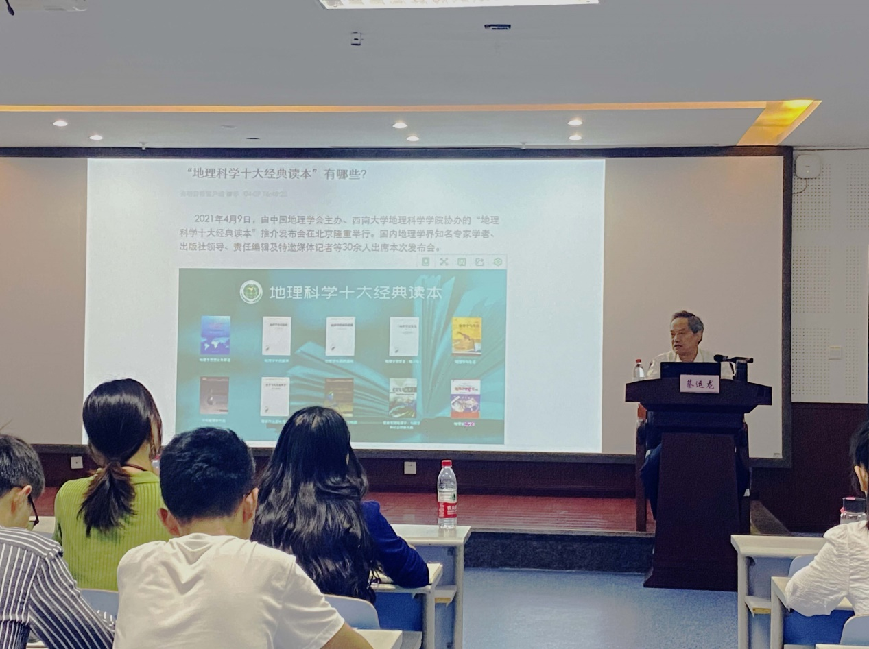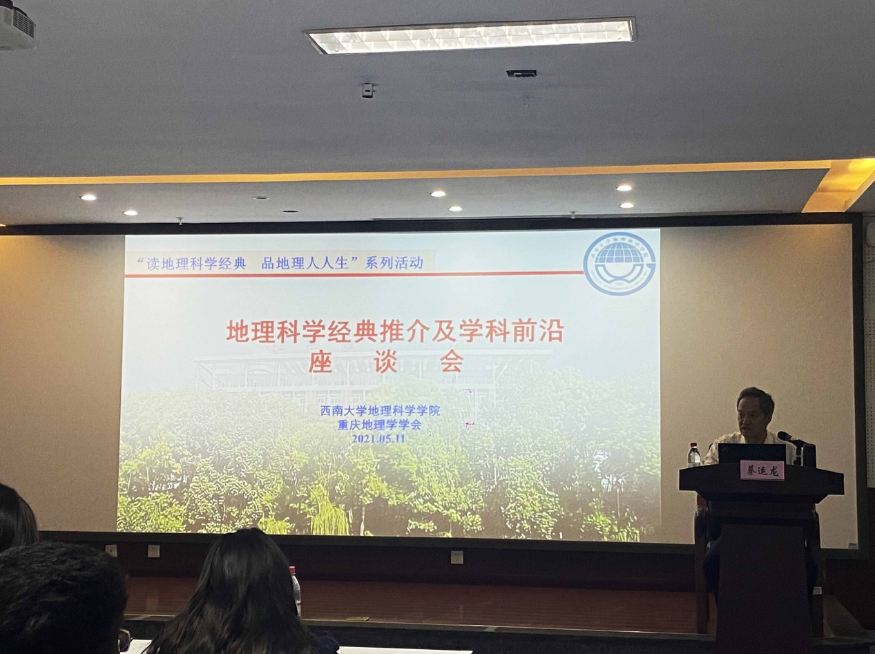 2021年5月11日下午3点,重庆地理学学会主办、388vip太阳集团协办的“读地理科学经典,品地理人人生”系列活动之“地理科学经典推介及学科前沿”座谈会在388vip太阳集团301教室举办。本次座谈会邀请了北京大学城市与环境公司与地理科学研究中心蔡运龙教授作为主讲嘉宾,地理科学公司党委书记喻尚其、副经理杨庆媛、副经理马明国以及杨晓霞、王成等多位公司教师和众多地科学子参加。