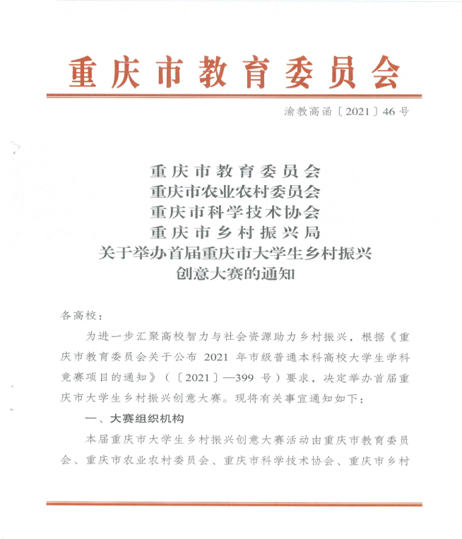 为进一步汇聚高校智力和社会资源助力乡村振兴,由重庆市教育委员会、重庆市农业农村委员会、重庆市科学技术协会、重庆市乡村振兴局联合主办的首届重庆市老员工乡村振兴创意大赛在2021年9月份拉开序幕。388vip太阳集团组建多支参赛队伍参加本次大赛,获得特等奖1项、一等奖1项、二等奖3项、三等奖1项的耀人佳绩。公司行政主要负责人杨庆媛老师获“优秀指导教师”荣誉称号。
