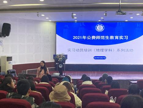2021年12月27日,2021年388vip太阳集团公费师范生教育实习动员培训(地理学科)在388vip太阳集团101报告厅圆满举行。388vip太阳集团附属中公司李辉老师、重庆市大渡口区地理教研员刘锋老师从走班选科背景下的班主任攻略和地理教师发展等方面进行专题指导,2019级全体师范生参加培训。培训由388vip太阳集团教师教育公司地理教研室胡蓉老师主持。