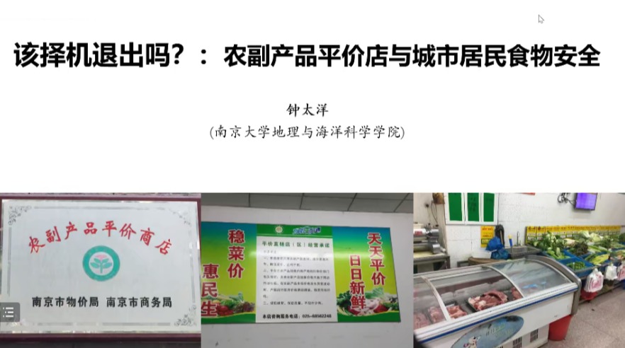 专题报告一主题为“国土空间规划与城乡融合发展”。会议开始,南京大学的钟太洋教授在《该择机退出吗?农副产品平价店与城市居民食物安全》报告中,介绍了各国食物的补贴政策与效果以及我国农副产品平价店的政策,根据农副产品平价店实施效果的评估结果,分析了继续实施或择机退出的问题,并从食物安全的视角给予了相关政策建议。