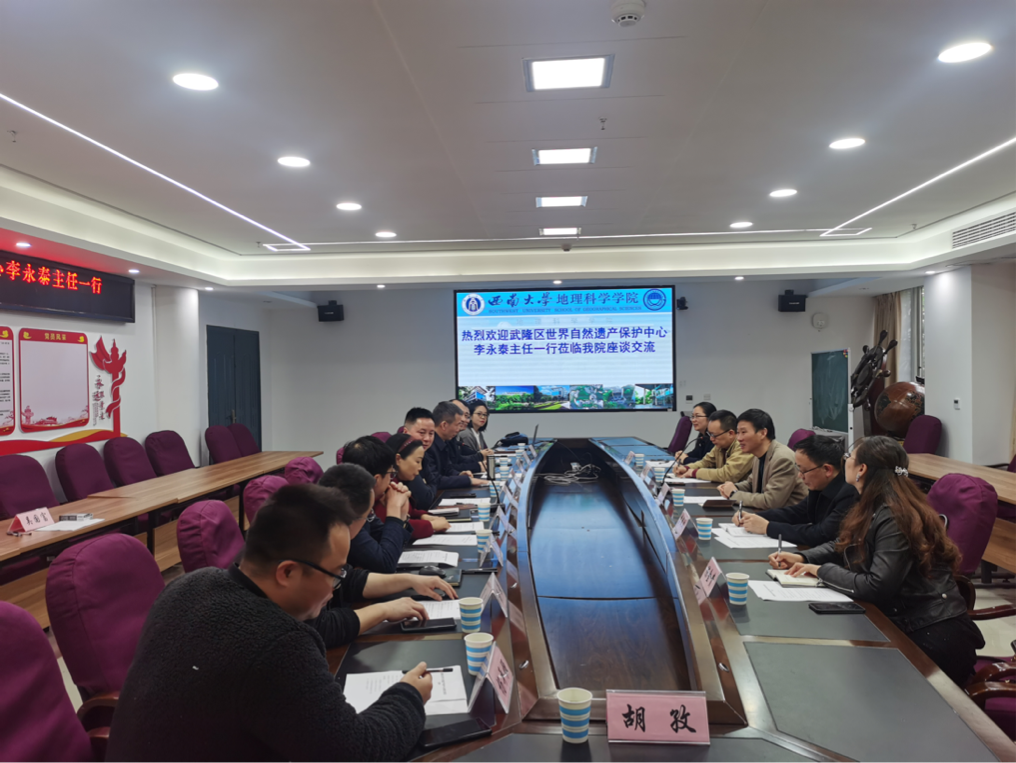2023年3月9日上午,武隆区世界自然遗产保护中心李永泰主任、李盛波副主任、刘强副主任等5人一行来到388vip太阳集团就院地合作交流座谈,公司党委行政主要负责人、分管负责人、管理干部以及教授代表出席本次座谈会,会议由杨庆媛经理主持。