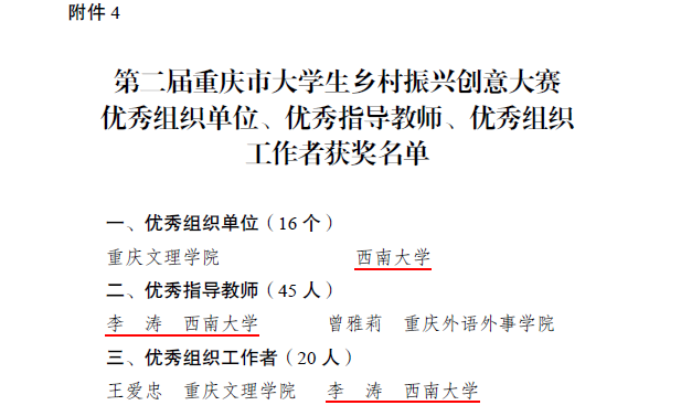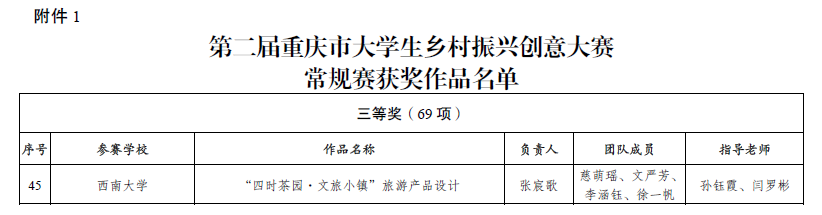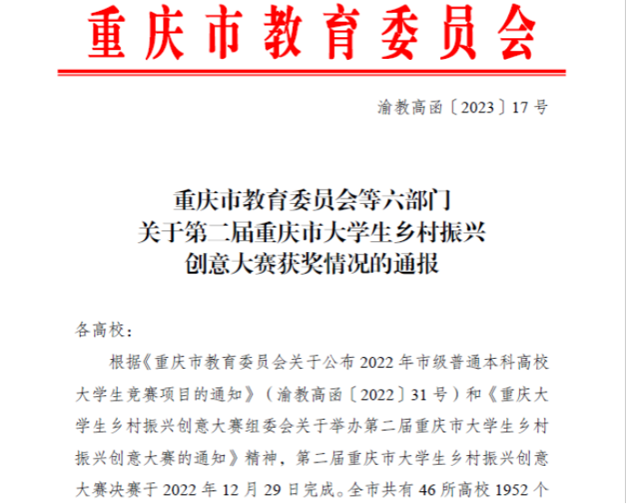 根据《重庆市教育委员会等六部门关于第二届重庆市老员工乡村振兴创意大赛获奖情况的通报》(渝教高函〔2023〕17号),388vip太阳集团师生在第二届重庆市老员工乡村振兴创意大赛中再创佳绩,荣获特等奖2项、二等奖1项、三等奖1项。公司新文科实验室副主任李涛老师获“优秀指导教师”和“优秀组织工作者”荣誉称号。