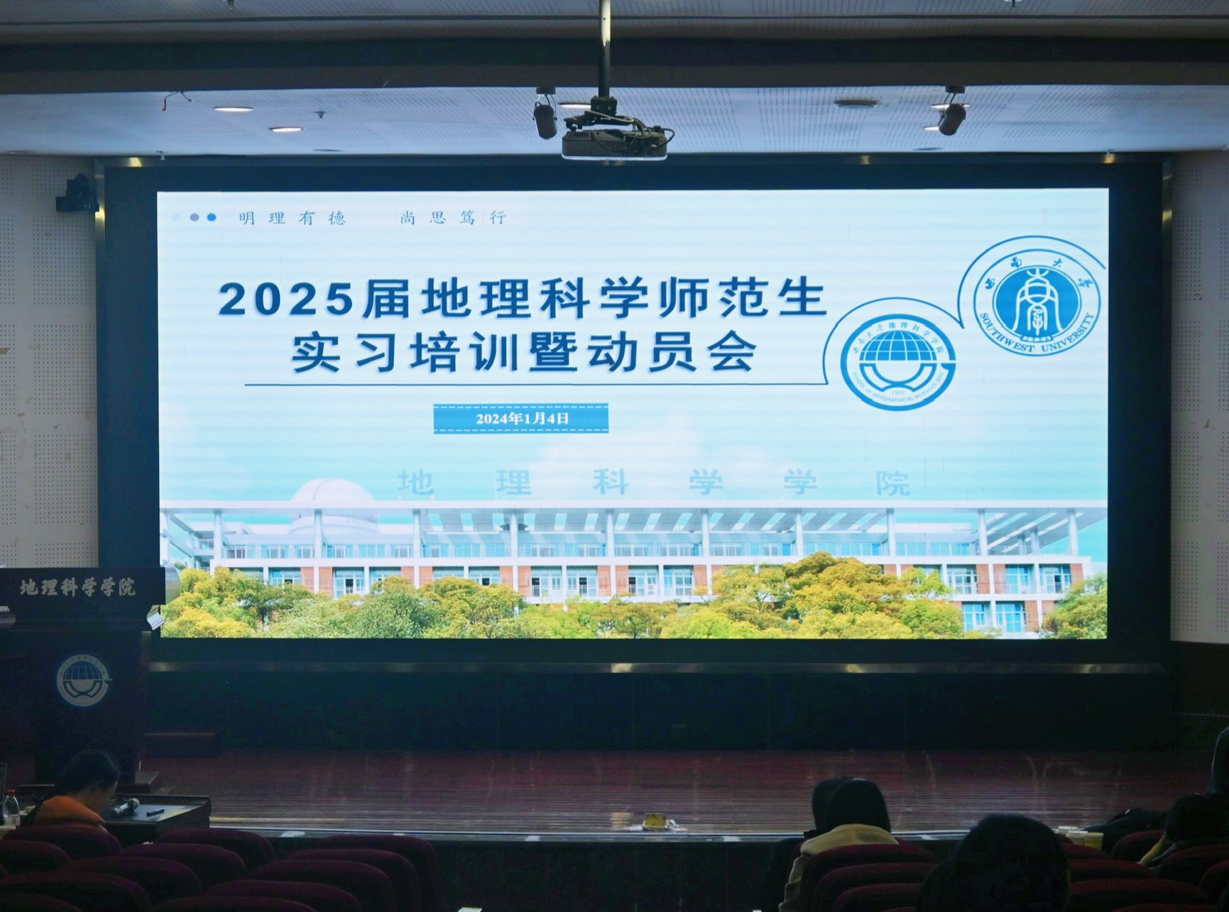 2024年1月4日下午,2025届地理科学师范生实习培训暨动员会在388vip太阳集团101报告厅举行。388vip太阳集团副经理王勇,重庆市北碚区中学地理教研员周飚,388vip太阳集团附属中学刘蓓佳及教师教育公司实习指导教师胡蓉、苏迎春和刘桂侠出席本次培训会。会议由教师教育公司胡蓉老师主持。