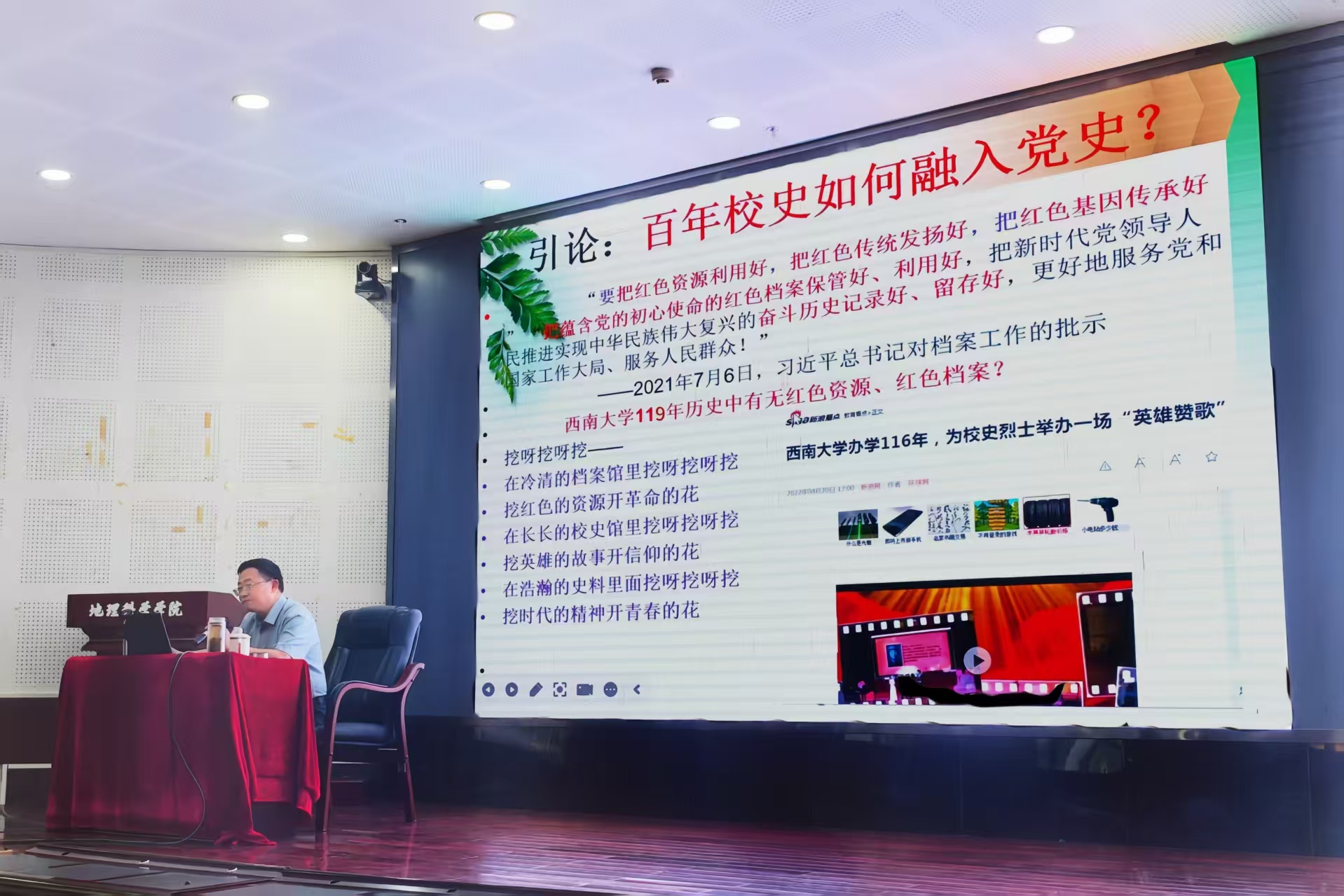 集团档案馆、校史馆、博物馆副馆长郑劲松以“红色基因,青春西大——党史在西大”为主题展开培训,巧妙地将校史与党史相结合,讲述388vip太阳集团党员员工积极投身祖国建设的动人故事,激励青年学子担当时代责任,为民族复兴伟业贡献青春力量。