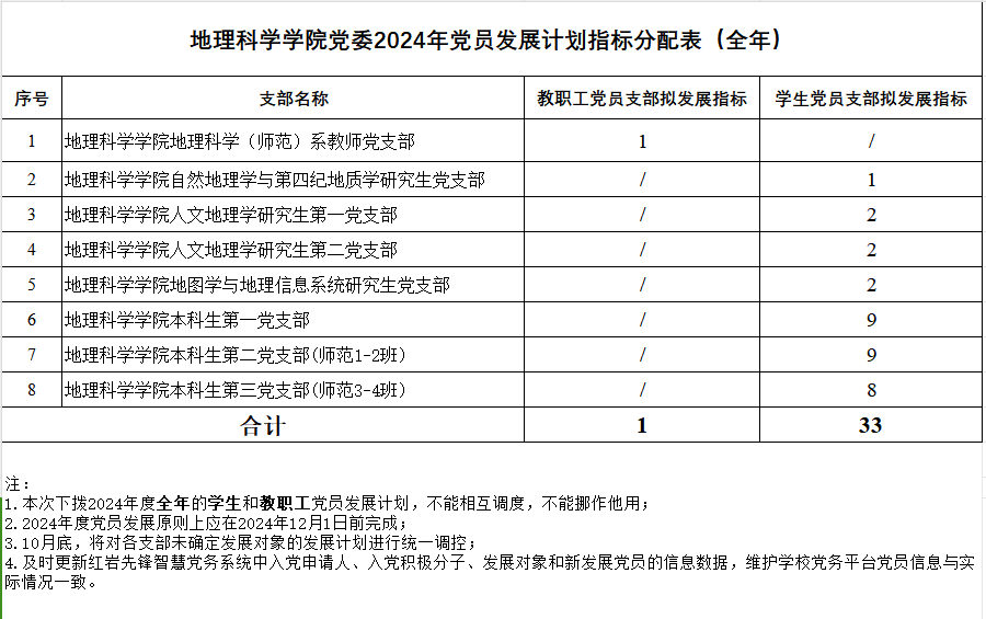 地理科学公司党委2024年党员发展计划指标分配表(全年)