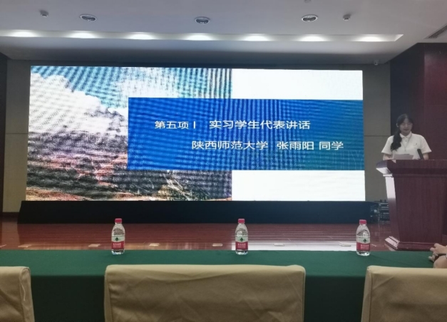 陕西师范大学实习员工代表张雨阳发言。她满怀着对地理学的热爱和对此次旅途的期待,代表全体同学做出郑重承诺:保证遵守实习纪律,认真完成实习任务。希望通过本次实习,不断锤炼本领,赓续地科薪火,鸣奏时代华章。